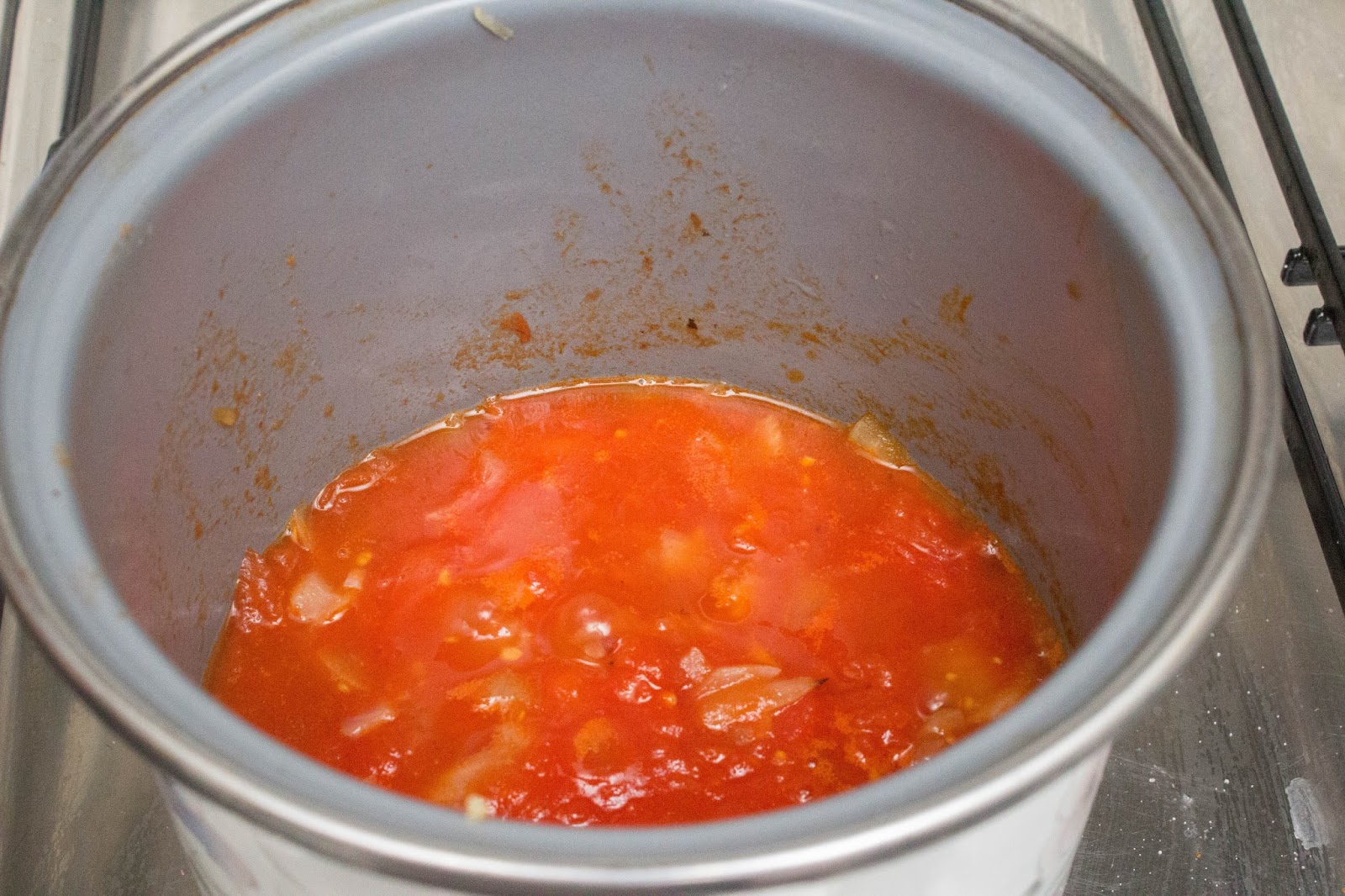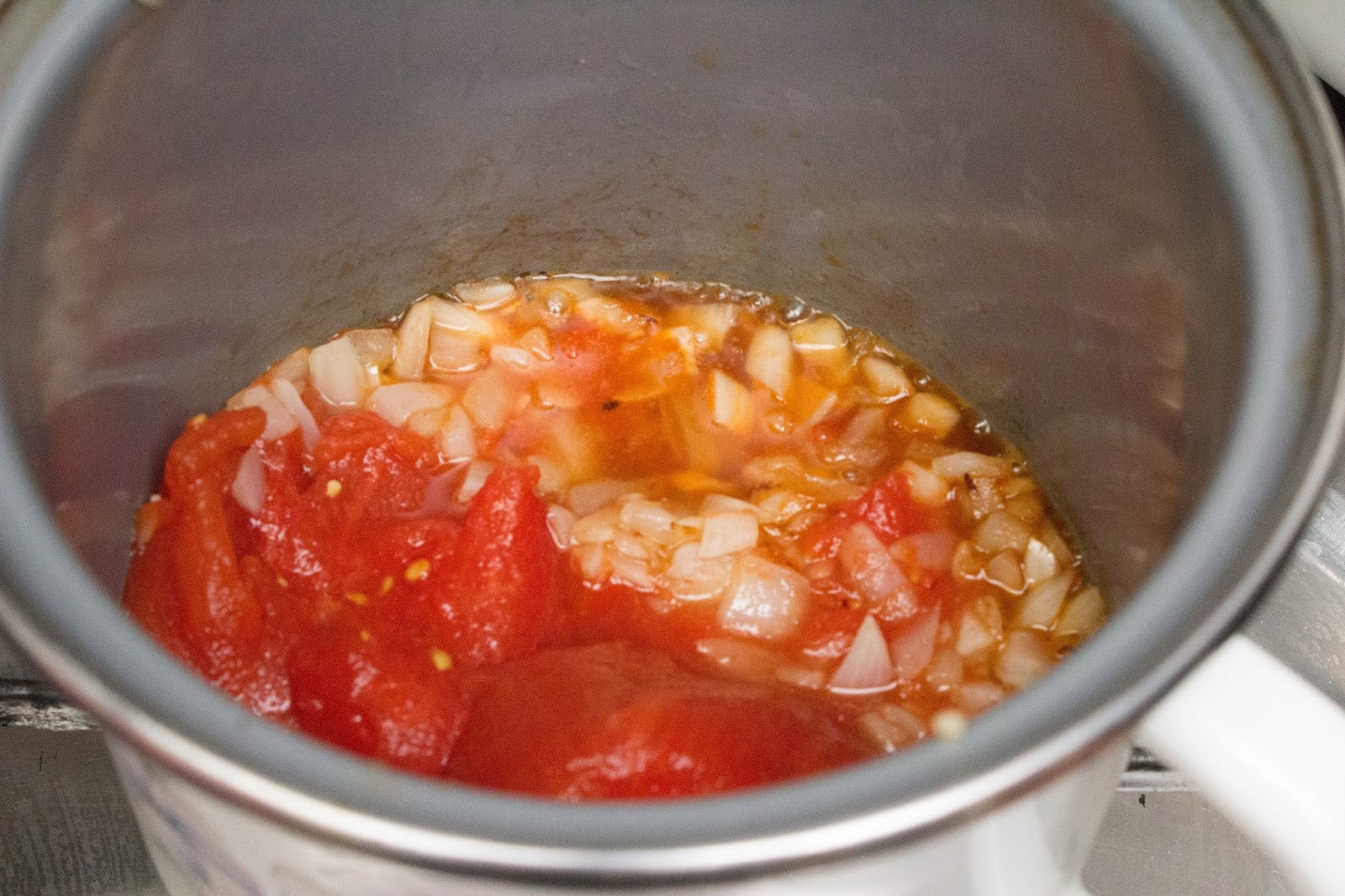 Cuando esté bien rehogada, añadir los tomates enteros pelados y poner todo al fuego medio-bajo. Con una cucharada de palo ir aplastando el tomate y removiendo.