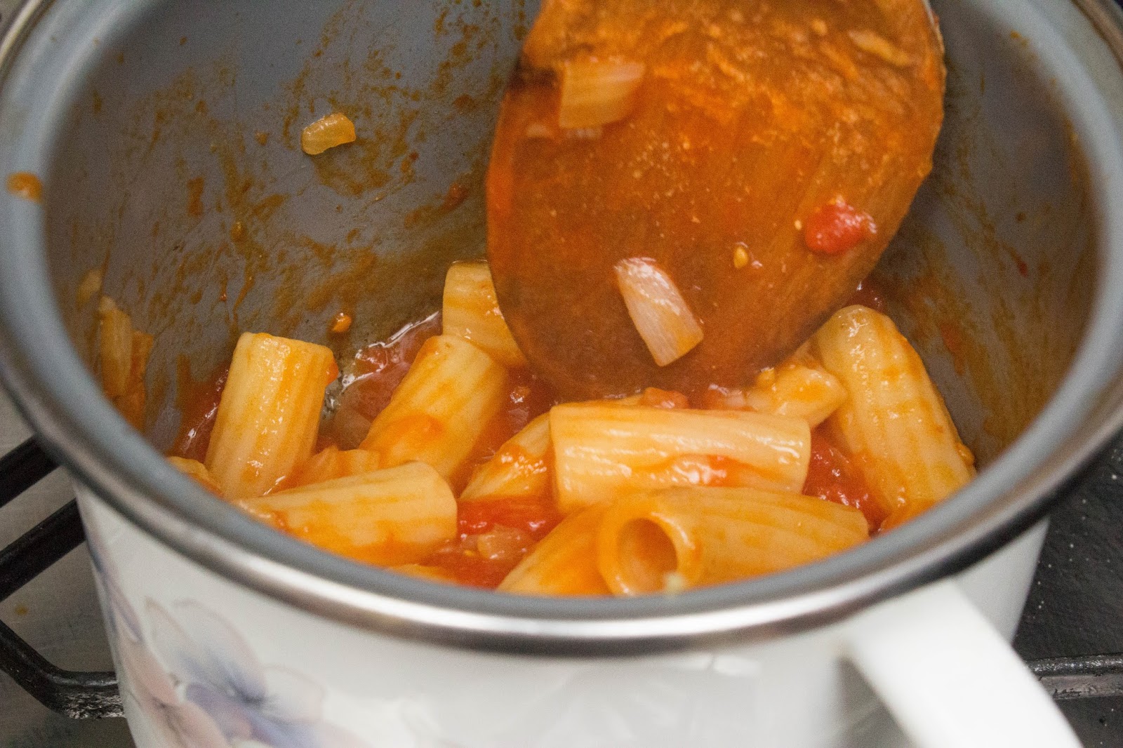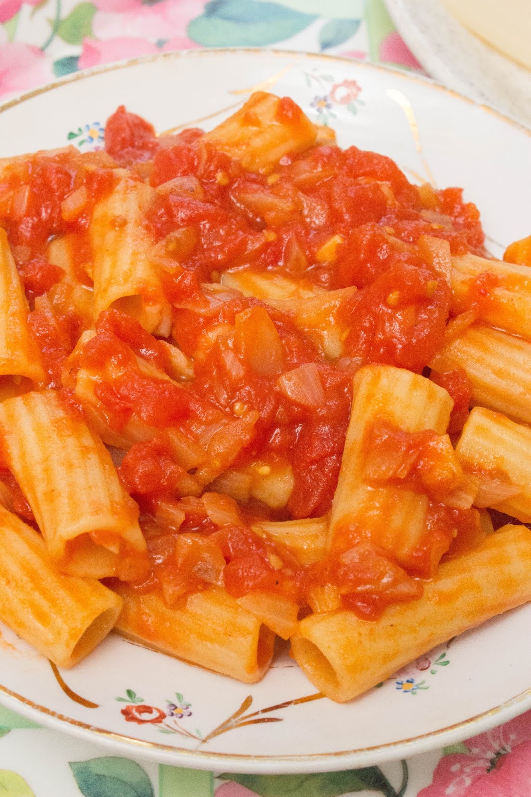 Ingredientes 1 persona:60 g macarrones40 g de cebolla3 tomates en tarro pelados naturales1 cuchadadita edulcorante1 pizca de sal3 espárragos blancos100 g de cinta de lomo
