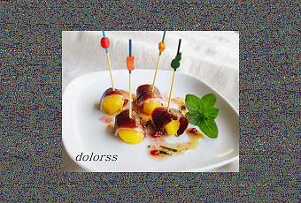 Mango con jamón de pato y vinagreta de arándanos