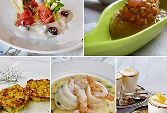 Aperitivos Carpaccio de ternera con salsa de queso y arándanos Cucharilla de salmón ahumado Primer plato Pastelitos de calabacín y queso cheddar Segundo Plato Popietas de lenguado rellenas de langostinos y salsa de puerros