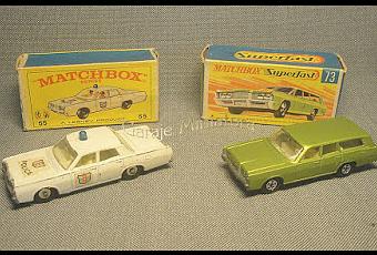 La particularidad de estas dos piezas del catálogo de Lesney Products & Co. Ltd. eran que tenían el mismo número. Así constaba en sus respectivos chasis. Podían tener los números 55 o 73. Eso dependiendo del año del catálogo. En este caso el 55 corresponde al Mercury Park Lane y el 73 ala Mercury Commuter.