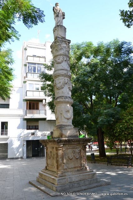 Dejamos la Basílica y nos dirigimos a la Plaza Joan Miró donde se encuentra el Obelisco de Santa Eulalia, fue erigido en 1633 en honor de la mártir patrona de Mérida. Se emplearon en su construcción diversos materiales entre los que destacan piezas romanas, como tres aras cilíndricas y un capitel corintio, coronando el conjunto colocaron la imagen de la mártir con un togado. Cuenta una leyenda que se remonta al siglo XVII que cuando el pueblo de Mérida se portaba mal o cuando se avecinan sobre la ciudad grandes desastres y calamidades la imagen misteriosamente giraba 180 grados sobre si misma y se colocaba mirando hacia su iglesia y dando la espalda a la ciudad. Se tiene constancia de que se volvió por primera vez en el siglo XVII, cuando una gran epidemia de peste asoló gran parte del oeste peninsular. En 1936, año de comienzo de la Guerra Civil Española la imagen volvió a rotar, dándole la espalda a la ciudad de Mérida. La realidad se descubrió posteriormente y es que la pieza que conecta la cabeza con el cuerpo al enfriase se contrae y cogía holgura, de forma que con el viente la cabeza se movía.