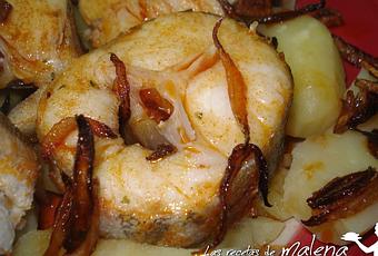 Mientras se cuece la merluza preparamos la salsa. En una sartén con cuatro cucharadas de aceite freímos los tres dientes de ajo cortados en láminas y la otra mitad de la cebolla cortada en juliana hasta que estén bien dorados. Dejamos entibiar el aceite, añadimos el pimentón dulce y una cucharada de agua donde hemos cocido la merluza, removemos.Retiramos las patatas con una espumadera para escurrir el agua y las colocamos en el fondo de una fuente, ponemos por encima la merluza y repartimos la salsa. Servimos inmediatamente para que no enfríe.