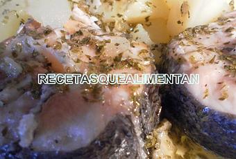 Servimos la Merluza a la Marinera en una fuente, acompañando con patatas cocidas aparte.