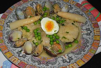 4 rodajas de merluza2 dientes de ajouna cebolla pequeñaun vasito de caldo de pescado12 almejas4 espárragos2 huevos duros100 gr de guisantesperejilun vasito de vino blanco secoaceite, sal y harinaPreparación: