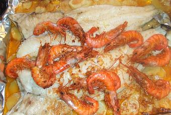 Unos minutos antes de que esté la merluza ponemos a la plancha los langostinos y en otra sarten con una gota de aciete se frien los ajos.