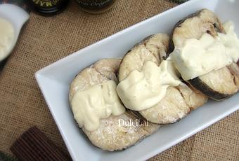 En casa la merluza es el pescado que más consumimos ya que tiene un sabor muy suave y, tanto a los niños como a mi (que no soy muy de pescado...), nos gusta más. Es un pescado blanco con un contenido graso y calórico bajo y, en cambio, es rica en proteínas completas o de alto valor biológico y posee diferentes vitaminas y minerales, destacando su contenido en vitaminas del grupo B (B1, B2, B3, B9, B12). Hoy os enseño una idea sencilla pero gustosa para acompañar unas rodajas de merluza al horno: ¡con una deliciosa salsa de mostaza!