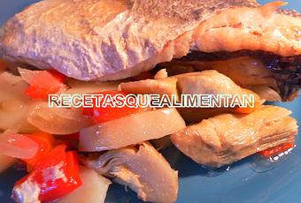 INGREDIENTESUna merluza, 500 gr. patatas, una cebolla, un pimiento rojo, una zanahoria, 4 alcachofas, 4 dientes de ajo, 250 gr. guisantes, aceite de oliva, pimienta negra molida y salPREPARACIÓNPrecalentamos el horno a 200º C. Cogemos una fuente de horno en la que vertemos un chorro de aceite de oliva.