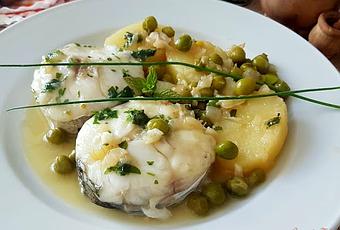 - Añadimos las patatas a la cazuela y las removemos para impregnarlas del sofrito y las dejamos dorar unos minutos, agregamos los guisantes removemos y dejamos cocinar un par de minutos, incorporamos el vino, subimos el fuego para se evapore un poquito y cubrimos con el caldo, salpimentamos, tapamos la cazuela y dejamos a fuego suave 10 minutos + . Comprobamos que las patatas estén casi cocidas e introducimos el pescado en la cazuela, tapamos de nuevo y dejamos hacer unos minutos, 7 +.