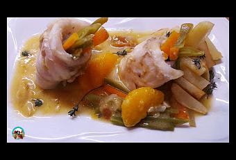 Merluza con salsa de naranja, rellena de verduras y una papas fritas. Una receta que se hace en un pispás. Un plato muy aromático, suave y ligero.Si en casa os gusta comer pescado, esta es una buena receta para disfrutar de ricos sabores sin dejar de alimentarse bien.