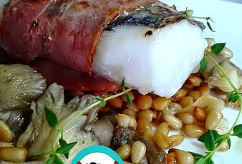 Para hoy tenemos un lomo de merluza envuelto en beicon una guarnición de lentejas, setas y piñones.