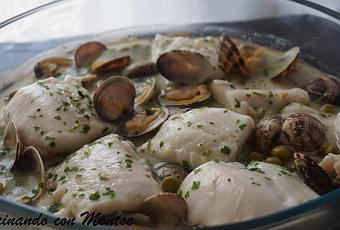 Agregamos a la bandeja las rodajas de merluza, los guisantes, el vino, sal y las almejas.