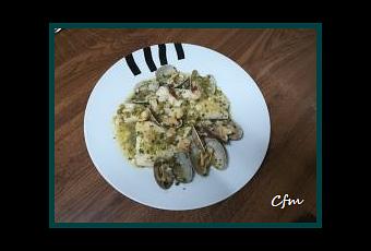 -2 lomos de merluza-200 gr de gambas-200 gr de almejas -Unos pocos guisantes-1 cebolla -2 dientes de ajo-Perejil -1/2 vaso vino blanco-Harina-Maizena-Caldo de pescado-Aceite de oliva-SalELABORACION -Lavamos las almejas bajo el grifo, las ponemos en un bol con agua y una pizca de sal durante dos horas, cambiando el agua un par de veces-Pelamos las gambas y las reservamos-Ponemos al fuego una cazuela de barro con un chorrito de aceite-Sazonamos el pescado por ambos lados, lo enharinamos ligeramente, dejamos que se doren y reservamos -En ese mismo aceite pochamos la cebolla y los ajos muy picaditos, echamos una pizca de sal y mezclamos bien hasta que empiece a dorarse -Añadimos la Maizena disuelta en el vino blanco, removemos y dejamos reducir unos 3 o 4 mins-Echamos las almejas y tapamos la cazuela para que se abran-Incorporamos el caldo de pescado sin dejar de remover y dejamos que la salsa espese un poco -Colocamos con cuiddo los lomos de merluza, repartimos alrededor las gambas y los guisantes y añadimos esparcido el perejil -Meneamos la cazuela para que la salsa vaya ligando-Ponemos la tapadera y dejamos cocinar a fuego lento durante unos 5 ó 6 mins-Pasado ese tiempo, apagamos el fuego y añadimos otro poquito de perejil