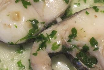 6 Rodajas grandes de Merluza fresca2 ó 3 Dientes de ajo1 Ramillete de Perejil fresco1 Cucharada de Harina de maíz SalAceite de olivaFumet hecho con la cabeza y las espinas de la merluza, y una hoja de laurel