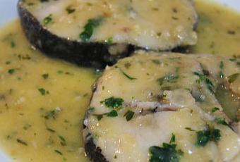 1. Picamos finamente la cebolla, el ajo y el perejil. Freímos la cebolla y el ajo en una cazuela o sartén grande con aceite de oliva, cuando estén pochados añadimos la mitad del perejil, removemos unos segundos e incorporamos la harina, la freímos sin parar de remover, añadimos el vino y el caldo de pescado y seguimos removiendo hasta que se mezclan todos los ingredientes y se ligue la salsa.