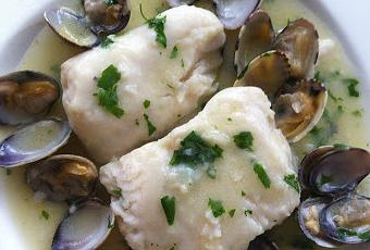 Se pone al fuego una cazuela de fondo amplio y se cubre el fondo con aceite. Se calienta y se añade el ajo picado, se remueve y se deja que se dore sin quemarse. Se agrega la harina y se tuesta unos instantes, removiendo con una cuchara de madera. Se vierte el caldo de pescado y se remueve, como si se hiciera una bechamel. Cuando esté trabado, se incorporan los lomos de merluza, colocándolos con la piel hacia arriba. Se cuecen a fuego lento, moviendo suavemente la cazuela por las asas, durante 4 minutos.