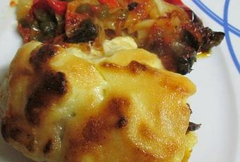 Ponemos el grill a 200º, sacamos la fuente y cubrimos con el alioli, los lomos de merluza, podemos retirar las laminas de ajos fritas, yo quería perder peso, por eso mi lomo, lo deje con las laminas de ajo y sin el alioli.