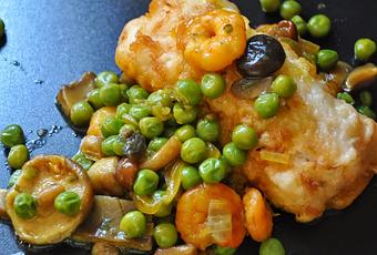 Retirar el aceite de la sartén, agregar la cebolla en juliana, y el ajo picado, cuando esté pochado, agregar las gambas y las setas y mover un poco para se se sofrían.