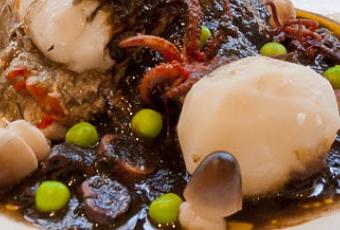 Primero se coloca la merluza en el plato (la cogemos del cestito del vapor con una espátula para que no se rompa y mucho cuidado) y a continuación ponemos unas cucharadas generosas de salsa (muy caliente). A un ladito la patata blanca, los guisantes por encima, los tentáculos que teníamos reservados y un chipirón entero por comensal y algunas setas desordenadas por el plato.