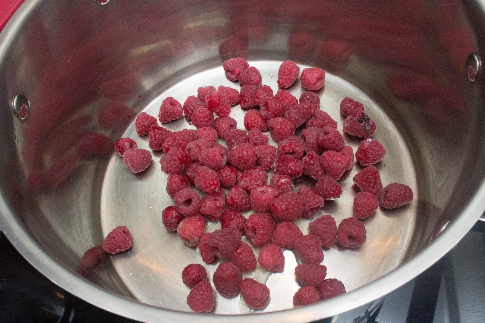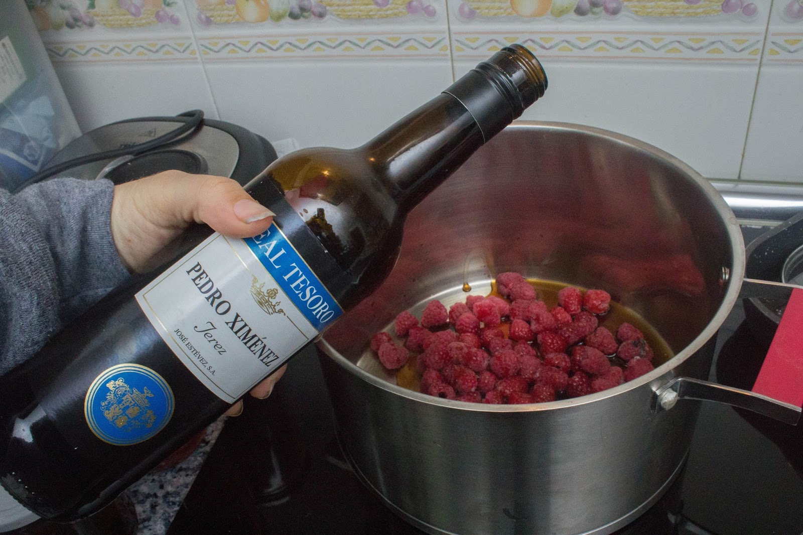 300 gr de frambuesasun chorro de Perdo Ximenez, como 1/3 de vaso300 gr de stevia en polvo2 vasos de agua