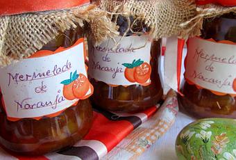 Añadir el azúcar a la preparación y dejar cocer la mezcla a fuego suave hasta que haya alcanzado la textura de la mermelada (puede ser necesario añadirle un poquito de agua... se hará siempre en pequeñas cantidades) Para saber cuando está en su punto, vertemos una cucharada en un plato, si queda adherida al plato, está en su punto.Para envasar la mermelada se necesitan recipientes de cristal con cierre hermético. Hay que esterilizarlos convenientemente en agua hirviendo con sus tapas durante varios minutos ( yo los esterilizo 20 minutos y los seco en el micro). Deben estar calientes cuando se envasa la mermelada.Se sujetan los botes calientes con unas pinzas o un guante de cocina, se rellenan con la mermelada recién hecha y se procede a cerrarlos con sus respectivas tapas. se colocan boca abajo y se dejan hasta que estén fríos. Después se limpian por fuera con agua y jabón, comprobamos que las tapas han hecho el vacío, se etiquetan y por último se pone una tela o una blonda, que sujeta con una goma, que cubriremos con una cinta.