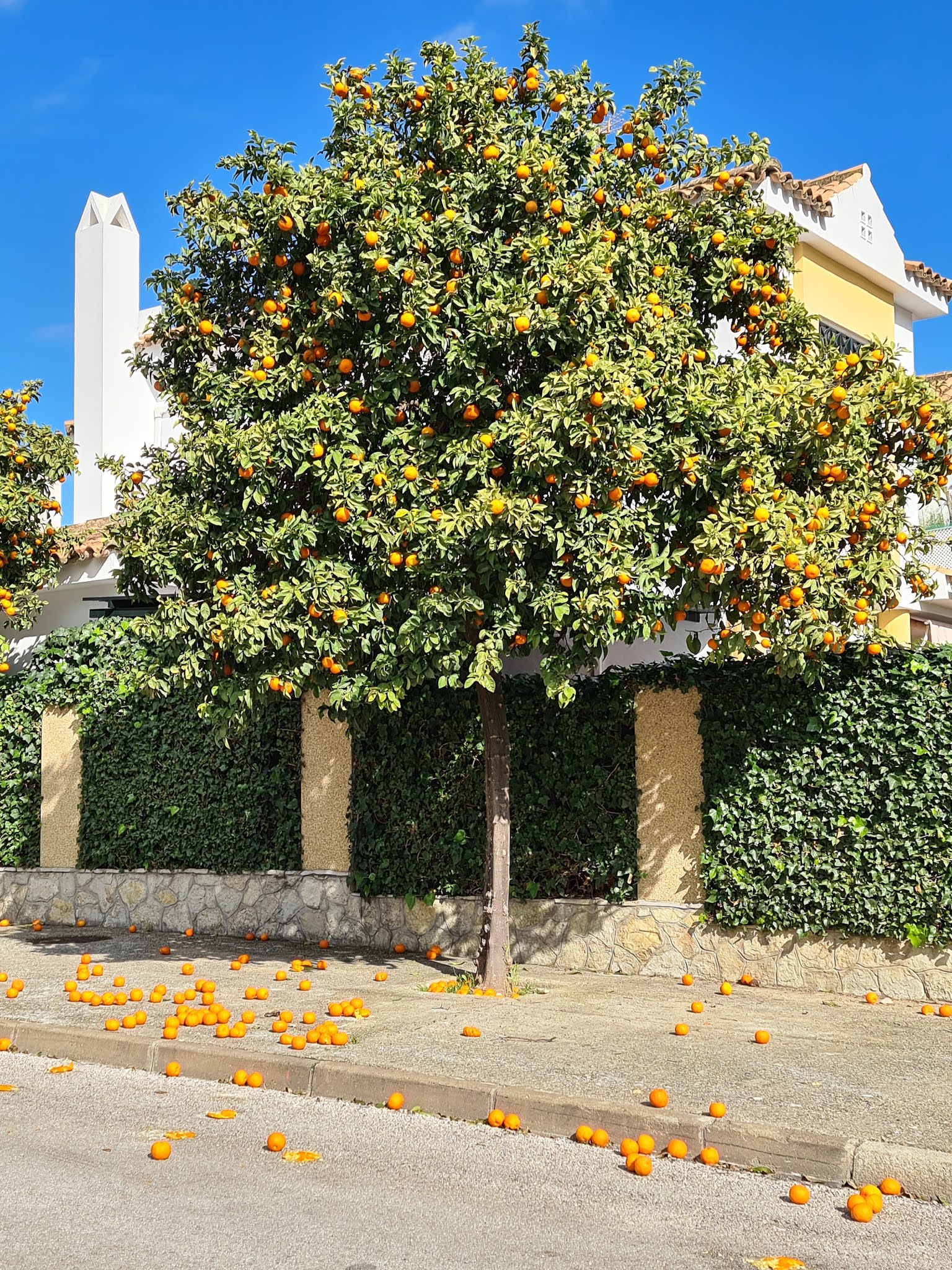 Así que dando mi paseo diario, vi varios naranjos, pero al mirar al suelo, estaba lleno de naranjas que se desaprovechan, así que, como me da pena tirar comida, cogí del árbol 10 naranjas. Total... se iban a caer...
