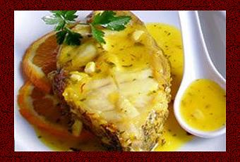 Se dora el mero y se le añade sal, pimienta, un poquito de azafrán, el zumo de las naranjas y el zumo de limón.