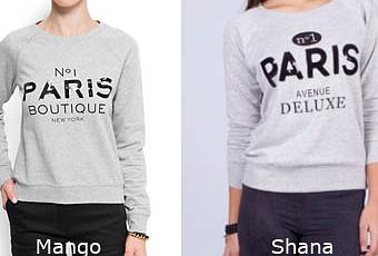 Comenzamos con uno que os va a encantar, aunque os adelanto que al tiempo os va a partir el corazón. ¿Os acordáis de la sudadera de Mango de París, que está agotadísima? Pues Sandra la ha localizado en Shana (bien!) pero nos adelanta que la calidad deja mucho que desear (mal!). Por si alguna quiere comprobarlo por sí misma, recordamos que la Mango cuesta 19,99 euros, y la de Shana, 12,99 euros.