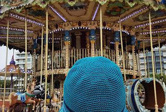 Cosido en circulo hasta adaptar a tamaño de cabeza con aguja de crochet de 3.5mm, en la zona de los bordes lleva el aumento para que haga la forma de la bisera.