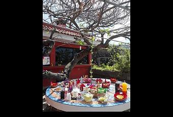 En el patio exterior había una mesa redonda muy grande y colorida, la cual me pareció ideal para dar la bienvenida y servir los entrantes: