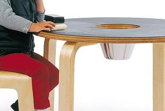 La mesa es de formato circular con el tamaño ideal para que los niños dibujen comodamente, viene con asientos a medida, todo realizado en madera tratada con el mismo sistema que se utiliza para las tablas de surf, por lo que son muebles realmente sencillos de limpiar.