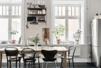 En este piso de 74 m² con distribución diáfana, cocina - comedor y salón abiertos usan muy bien esta disposición de sillas, podemos reconocer algún modelo Thonet, también serie 7 de Fritz Hansen, etc.