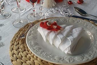 Y la inspiración a parte de los colores del gorro de Papa Noel........ el árbol de Navidad, repartiendo guirnaldas, pequeñas bolitas y figuras de abeto por la mesa e incluso doblando las servilletas creando su figura.