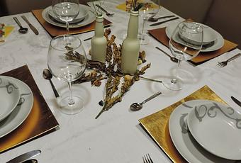 Hoy os presento una mesa con toques dorados, sin recargarla mucho. He escogido un mantel blanco para dar protagonismo al centro y a los bajoplatos.