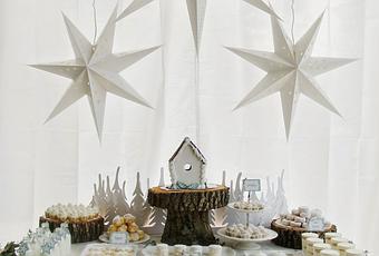 ¿A quien no le gusta un dulce, una galletita, un trozo de chocolate o buen turrón? Que levante la mano porque seria un rarete! jeje. Y si ya lo juntamos todo y lo ponemos en una mesa de dulce decorada para esta fecha tan especial seria una gran idea, sobre todo para degustar todos los dulces típicos navideños que siempre hacen nuestras abuelas, tías y madres. Y utilizando una temática invernal y no solo para estas fiestas, también quedaría fantástica para una boda de invierno ¿No creéis? Esta super bien montada no le falta detalle con esas maderas, hiedra y estrellas formando todo el decorado, incluso esos graciosos pinos de fondo; lo hacen todo más especial. ¡Un pequeño bosque muy dulce!