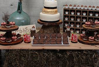 En cuanto a los dulces, la tarta era bizcocho de vainilla y crema de fresas con fresas naturales maceradas en almíbar. Si os fijáis, uno de los pisos de la tarta, es el "anillo único", ya que su historia de amor comenzó con una anécdota del "Señor de los Anillos", y el resto era una tarta elegante de boda, con fondant color crema y una cinta negra, evocando la sencillez del evento. También había brownies de chocolate y Oreo®, brochetas de golosinas, minicupcakes de avellana y crema de Nutella® y tacitas, unas de crema de queso y frambuesa y otras de crema de queso, Nutella® y Oreo®.