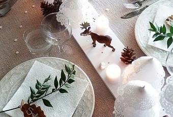 pinterestEn la primera imagen, vemos como han decorado el centro de la mesa con un camino o similar en blanco que resalta con el color del mantel y han colocado piñas, animales y unos árbolitos realizados con blondas de repostería, sobre el plato una ramita con una etiqueta en forma de hoja con el nombre. Sencillo y bonito al mismo tiempo, aunque complicado de retirar para la hora de comer o cenar, no os parece?