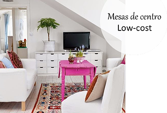No hay nada mas Low-cost que el reciclado, aprovechar elementos y mobiliario que ya no utilizamos y reutilizarlos dándole una nueva vida y un uso diferente. Es el caso de estas mesas de centro que están realizadas reciclando diferentes objetos y elementos, lo que supone no gastarnos una gran suma de dinero, tan solo un poco en el material necesario para restaurar cada pieza. En la mayoría de los casos un buen lijado y una mano de pintura es suficiente, como en el caso de la imagen de cabecera, una antigua mesa plegable se ha pintado en un llamativo color rosa, convirtiendose en el centro de atención del salón.