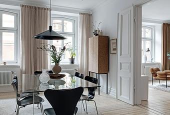 En el comedor de este apartamento nórdico de 100 m² la mesa pasa completamente desapercibida, dejándole el protagonismo a las 6 sillas Serie 7 de Fritz Hansen, por otra parte muy merecido, porque nos parece una silla preciosa :).