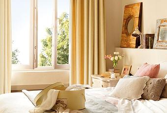 En este dormitorio, los muebles no son la apuesta principal. Lo es la pintura. Las franjas anchas parecen hacer la pared más alta. Y decoran convirtiéndose, prácticamente, en el auténtico cabecero de la cama. Tanto este como las mesitas y la colcha son de Pomax, en Cassai. La banqueta es de Gajisa, también en Cassai. La alfombra es de Zara Home y el pavimento, de mosaico hidráulico.