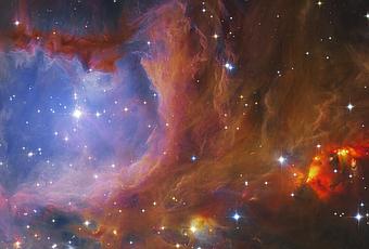 A menudo fotografiada pero raramente citada, Messier 43 es una gran región de formación estelar por sí misma. Tan sólo es una parte del complejo de formación estelar de gas y de polvo que incluye la más grande y más famosa vecina Messier 42, la gran nebulosa de Orión, que se ve en la parte inferior de la imagen. Este primer plano de Messier 43 se hizo mientras se probaba un instrumento de infrarrojo cercano con uno de los telescopios gemelos Magallanes de 6,5 metros del Observatorio Las Campanas que hay en los Andes chilenos. En la imagen compuesta se han sustituido las longitudes de onda infrarrojas, de otro modo invisibles, por los colores azul, verde y rojo. Cuando se dirige la mirada a las cavernas de polvo interestelar ocultas a la luz visible, la visión en infrarrojo cercano también se puede utilizar para estudiar las estrellas enanas marrones de la región. Messier 43, junto con su famosa vecina, se encuentra a unos 1.500 años luz de distancia al borde de la nube molecular gigante de Orion. A esta distancia, el campo de visión abarca unos 5 años luz.