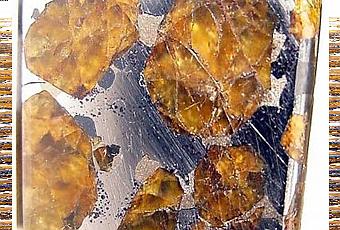 Las primeras imágenes corresponden a fragmentos de un meteorito caído en 1810 (en la época de Napoleón) en la región de Gomel, cerca de Minsk, capital de Bielorrusia. Se trata de una Pallasita (un raro tipo de meteorito metálico con inserciones de Olivina). Probablemente, son las piezas que más me gustan de mi colección.