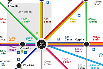 Un plano que parece un plano de metro, pero no lo es… En Pontevedra han diseñado este este esquema cogiendo la estética tan reconocida de este transporte para realizar el Metrominuto, o lo que viene a ser un plano con las distancia peatonales y tiempo que se tarda en recorrerlas.