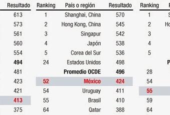 México se ubica en lugar 53 de 65 en el área de “Matemáticas”, con una calificación promedio de 413 puntos (en una escala de 0 a 1,000); superando a países latinoamericanos como Uruguay (409 puntos), Costa Rica (407), Brasil (391) y Perú (368); pero muy por debajo de las naciones y regiones asiáticas que encabezan en el ranking, como Shanghai, China (613 puntos), Singapur (573), Hong Kong (561), China Taipéi (560) y Corea del Sur (554 puntos).En cuanto a “Comprensión de Lectura”, México se sitúa en la posición 52 de 65 con una calificación promedio de 424 puntos, por encima de países de América Latina como Uruguay (411 puntos) yBrasil (410), pero debajo de Chile y Costa Rica (ambos con 441 puntos).México fue superado por más de 100 puntos (de una escala de 1,000) por los países y regiones en la parte más alta de este ranking: Shanghai, China (570 puntos); Hong-Kong, China (545); Singapur (542); Japón (538) y Corea del Sur (536 puntos).En “Ciencias”, los estudiantes mexicanos evaluados obtuvieron una calificación promedio de 415 puntos, con lo que el país se coloca en la posición 55 de 65 en este rubro, superando a países latinoamericanos como Argentina (406 puntos), Brasil (405), Colombia (399) y Perú (373 puntos).México está 165 puntos por debajo de Shanghai, China, que encabeza el ranking con 580 puntos; le sigue Hong-Kong con 555 puntos; luego Singapur con 551; Japón con 547 y Finlandia con 545 puntos.La prueba PISA es un estudio realizado cada tres años por 65 países y coordinado por OCDE, que busca evaluar la medida en que los alumnos de 15 años cerca del final de la educación secundaria han adquirido los conocimientos y habilidades necesarias para la participación acabada en sociedades modernas.La OCDE aclara que la evaluación no mide solamente si los alumnos pueden reproducir el conocimiento, sino que examina también qué tan bien los alumnos pueden usar lo que han aprendido y aplicarlo en contextos no familiares, tanto dentro como fuera de la escuela.En México el examen PISA 2012 fue aplicado a 33,806 estudiantes.Si deseas conocer los resultados de la ANTERIOR prueba PISA ingresa al siguiente enlace:http://covire.blogspot.mx/2010/12/la-educacion-en-mexico-gatea-hacia-la.htmlA continuación dos videos relacionados; el primero explica qué es PISA, mientras el segundo plantea un CAMBIO PROFUNDO en el paradigma del modelo de educación en el siglo 21.
