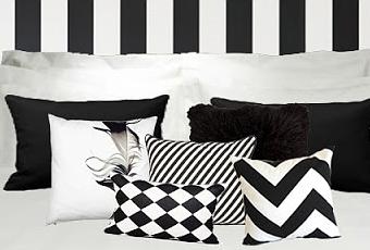 Otra opción es elegir estampados en dos gamas de color, como en la siguiente foto, todo el salón se basa en los colores gris y crema de la alfombra. Los cojines son totalmente diferentes entre ellos pero unos son cremas y otros grises combinados con blanco, esto crea también una relación de conjunto.