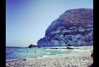 Alma no ha querido bañarse, pero no ha parado un momento de echar fotos. Creo que alguna de las veces ha disparado con su cámara en mi dirección, pero si lo ha hecho, sé que no las veré. Comí un sándwich de York y queso al salir del agua, pero ella no tenía hambre. Mientras estábamos sentados en mi toalla, revisaba las fotografías que había tomado y le pregunté a Alma si le apetecía andar un rato por el sendero del cerro que asomaba a la izquierda…no recuerdo si se llamaba Cerro del Cuartel o de la Higuera. Es un tramo que se tarda en recorrer unos veinte minutos aproximádamente, para llegar a otra cala con el nombre tan original de Cala de Enmedio. No le importaba caminar, así que nos dispusimos a ello a pesar de los 38 grados que nos freían la cabeza y todos los bártulos que llevábamos encima.