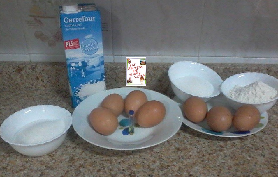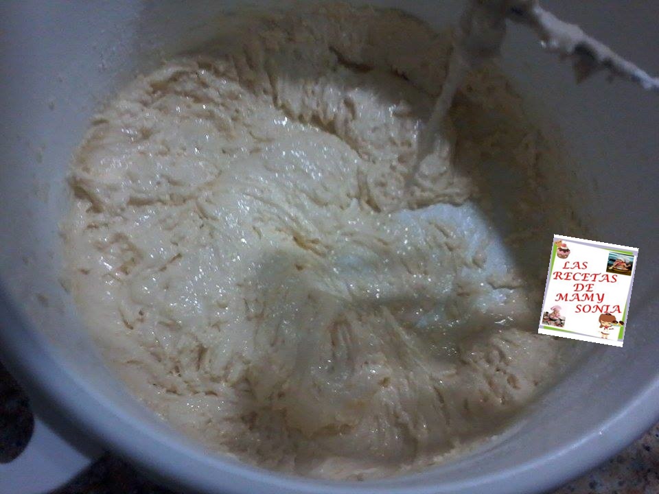 Batimos las yemas con el azúcar y cuando tenga consistencia de crema, le añadimos la harina tamizada(pasada por un tamizador o colador) y mezclamos bien.