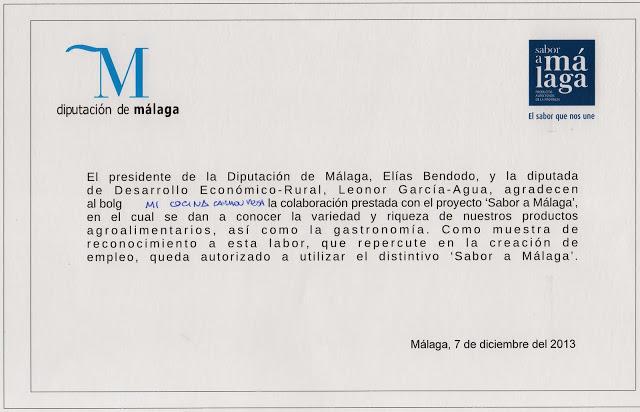 Desde éstas líneas quiero compartir con quienes siguen mi blog éste distintivo que me llena de orgullo como malagueña. Mi cocina, “la cocina de todos los malagueños” es un tributo a los fogones de antaño, evocada con nostalgia las recetas heredada de mis mayores, en la que intento “perpetuar” y conservar los platos tradicionales que veía preparar a mis más cercanos antepasados e incluso rescatando recetas de “mi memoria gustativa”. Este reconocimiento es un tributo a Málaga, a la tradición, como gratitud a las generaciones que nos han precedido, quienes nos han enseñado y alimentado engendrando nuestra actual cultura gastronómica, fruto de la “despensa” y de las aportaciones de las culturas que fueron forjando nuestra cocina genuinamente malagueña.Agradezco a Sabor a Málaga, éste reconocimiento, ésta distinción a Mi cocina, a mi blog, donde mis recuerdos, mi memoria, mi historia, las tradiciones, los platos de mi familia se convierten en un recetario de 367 (Trescientas sesenta y siete) entradas de RECETAS TIPICAS MALAGUEÑAS al dia de hoy, platos genuinos de nuestra querida Málaga.Dedicado a mi familia, en especial a mi marido por su paciencia y ayuda para que el blog exista, a mis amig@s y a tod@s los malagueñ@s.