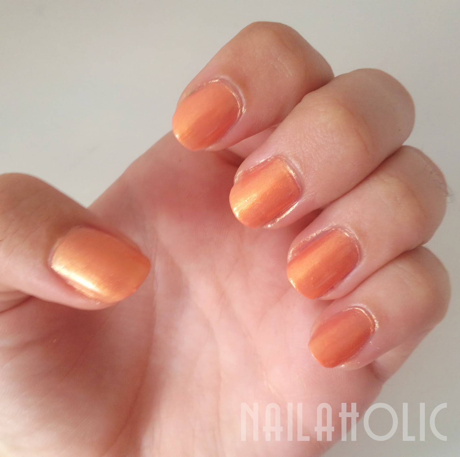 Este en concreto es el tono NP090 Golden Peach de la línea normal de Models Own. El tono es, como su propio nombre indica, un naranja melocotón con muchísimos reflejos dorados(tantos que según la luz que le dé hay veces que no se aprecia el naranja). Las fotos que veis llevan dos capas generosasde producto, y aún así si os fijáis bien se ven huecos no del todo cubiertos.Creo que se aprecian bastante bien los reflejos dorados, ¿no? x)