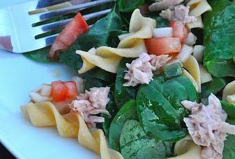 100 g de espinaca fresca 60 g pasta pequeño 40 g de tomate picado (medio tomate grande) 30 g cebolla picado (media cebolla pequeña) 125 g de atún de lata sal, a gusto30 g de aceite de oliva 10-15 g de vinagre balsámico Elaboración: Primero cocer la pasta hasta este hecho. Escurrir y dejar que se enfrie. Luego en un bol grande meter la espinaca.